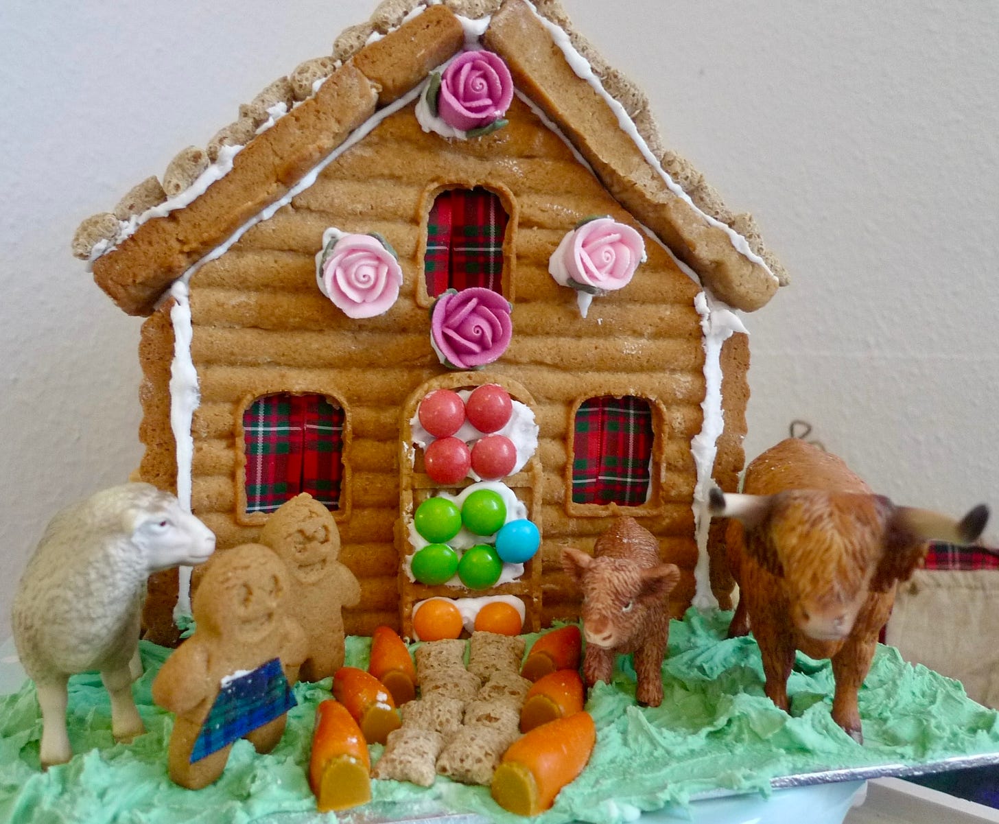 A Burn’s Day Gingerbread House that my daughter and I made when she was six! I love the curtains (tartan ribbons) the kilt (also ribbon) and the animals.