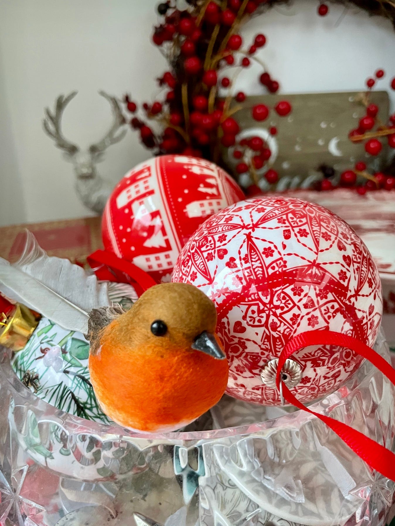 By Christmas itself I was beginning to feel better, I made a few short cuts to my usual food preparations, for instance I bought a Marks and Spencer Yule Log, rather than making my own Buche de Noel. (A sprinkling of icing sugar, my traditional robin and three mini Colin the Caterpillars, made it absolutely acceptable!)